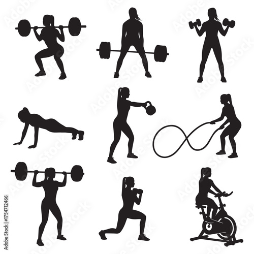 fitness, gym, silhouette, exercise, workout, push-up, squat, lunge, dumbbell, barbell, machine, posture, motion, strength, vector