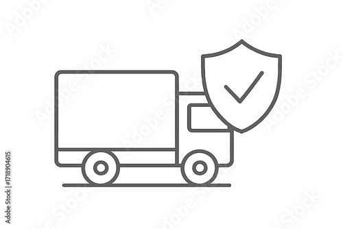 Outline vector illustration of delivery truck with shield and checkmark symbolizing secure shipping, protection, cargo safety, logistics, and transportation services design