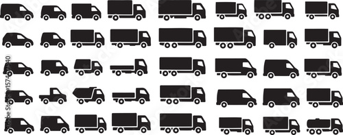 Delivery truck icon set in flat vector styles. Shipping vehicle collection, cargo transport group, logistic symbol set, freight service design, courier van, distribution illustration.