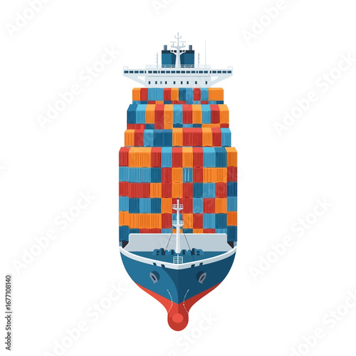 Vector art of a large cargo ship loaded with colorful containers sails across the blue ocean under a sky with white clouds, symbolizing global trade and logistics