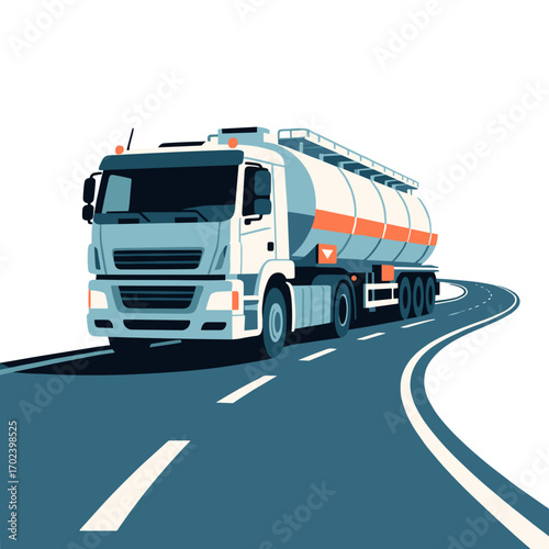 Illustration of a White Tanker Truck Transporting Liquid on a Winding Road with Blue Sky Background
