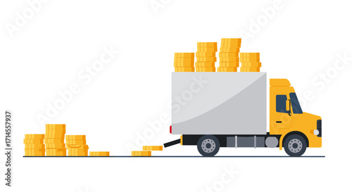 Flat yellow delivery truck carrying stacks of gold coins on white background