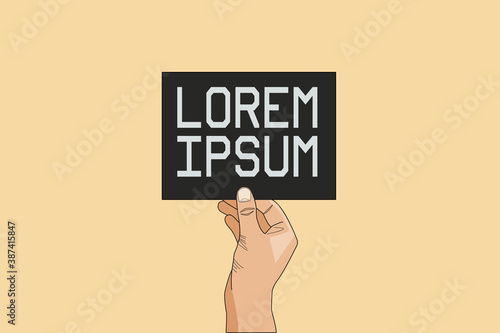 Template for a card, flyer, poster or brochure. Hand holding a card with a text "Lorem Ipsum". Yellow background. Illustration