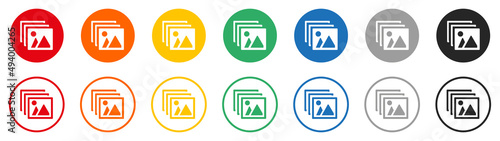 Set of gallery icons. Image symbol, image preview icon. Photo album, landscape photo image on circle buttons, colorful buttons. Picture placeholder vector.