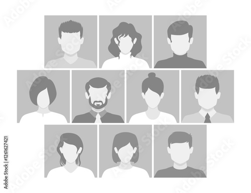 Monochrome silhouette profile avatars defoult photo placeholder feature diverse hairstyles and clothing styles. These placeholder images are ideal for social media profiles and online platforms