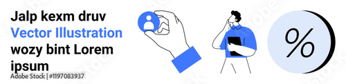 User profile icon in hand, person thinking holding tablet, percentage symbol in a circle, placeholder text. Ideal for business, finance, marketing, education, technology, communication