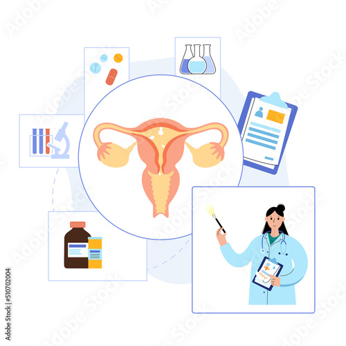 Doctor checkup reproductive system of woman. Health and disease uterus and ovary internal organ. Polycystic ovary syndrome, inflammation, pain. Vector illustration