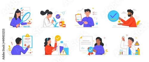 Quality control and product satisfaction research check Controlling business iso standard certificate accept Validation documents Inspection errors or mistakes Vector illustration concept Flat style