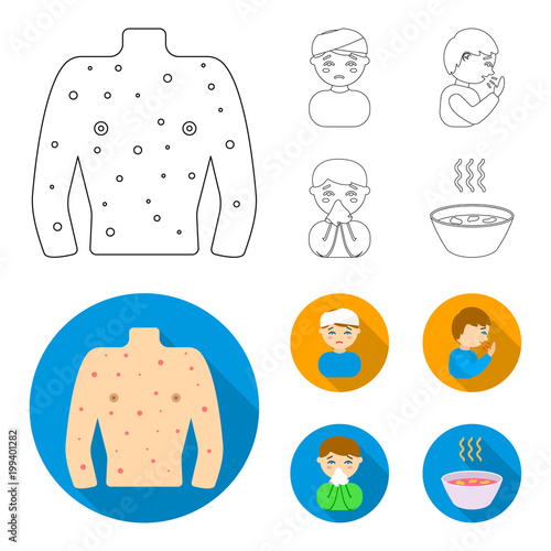 A man with a bandaged head, a man coughing, a man snorts a snot, a bowl, a bowl of hot broth into a handkerchief. Sick set collection icons in cartoon,outline,monochrome style vector symbol stock