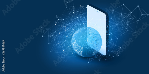 Abstract Blue Minimal Style Cloud Computing, Networks, Telecommunications Concept Design with Polygonal Mesh, Mobile Phone and Earth Globe - Vector Illustration