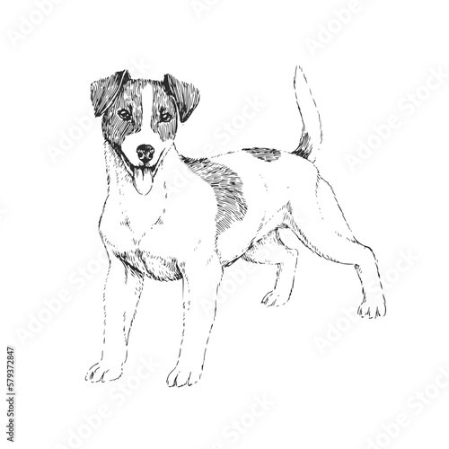 Vector hand-drawn illustration of Jack Russel Terrier in engraving style. Sketch with a cute pet isolated on white. A dog of hunting breed.