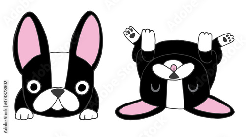 Boston Terrier pups awake and sleeping. Vector illustration.