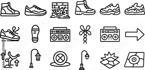 Street Dance Icons. Outline icon set of street dance practice: sneakers, cap, hoodie, headphones, boombox,