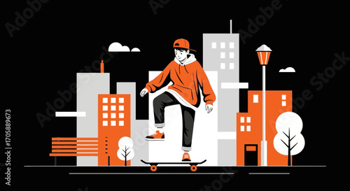 Youthful Skateboarder Performing Trick Amidst Urban Cityscape, Orange And Black Tones