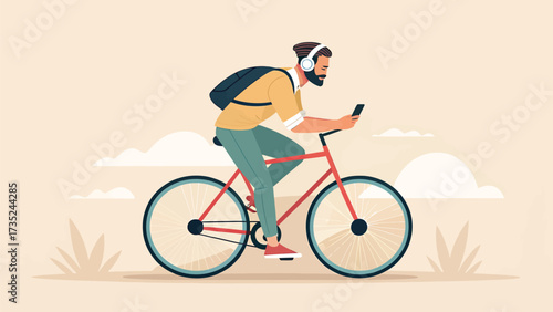 Cartoon boy enjoys cycling through a vibrant park under a sunny sky illustration