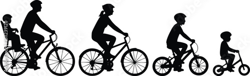 Silhouette of four individuals riding bicycles in a row with motion and balance
