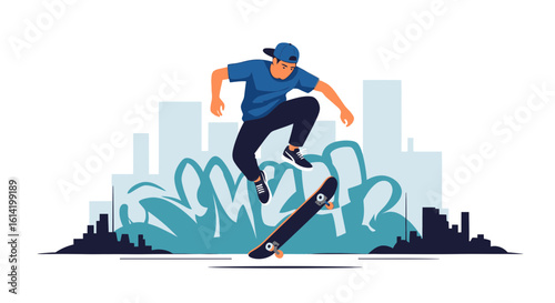 Skateboarder Performing Stunt Against Urban Cityscape Background With Modern Graffiti