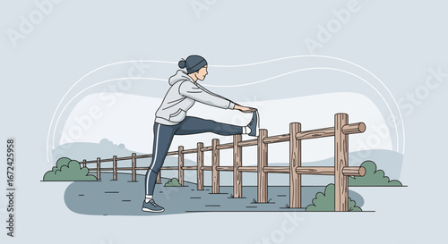 Athletic Female Stretching Her Leg Outdoors At A Wooden Fence For Pre-Workout