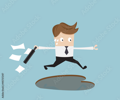 Avoiding obstacles, Traps along the business path, Businessman runs through holes and obstacles to achieve business success, Overcoming difficulties, Skills and abilities to achieve victory.