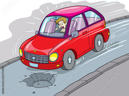 Vector cartoon stick figure illustration of driver driving car on very bad road with asphalt full of potholes.