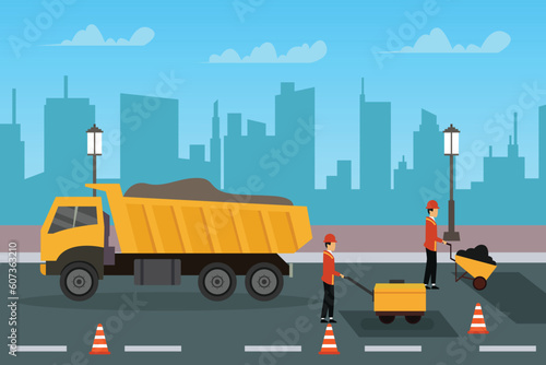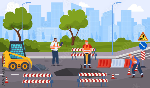 Workers with machinery doing repair roads vector flat cartoon illustration professional constructing