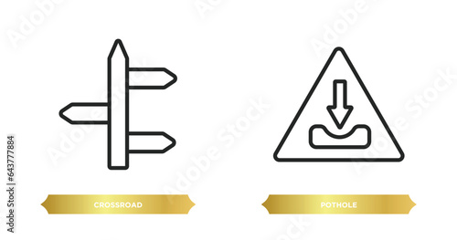 two editable outline icons from traffic signs concept. thin line icons such as crossroad, pothole vector.