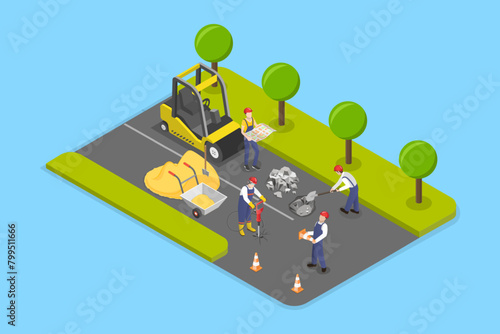 Workers repair the road surface isometric 3d vector illustration concept for banner, website, illustration, landing page, flyer, etc.