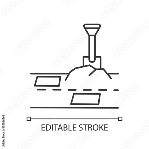 Patching works pixel perfect linear icon. Roadworks construction. Fill ground hole with shovel. Thin line customizable illustration. Contour symbol. Vector isolated outline drawing. Editable stroke