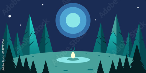 Vector art of a serene christmas tree forest with a full moon, a minimalist vector illustration for winter holidays and seasonal greetings