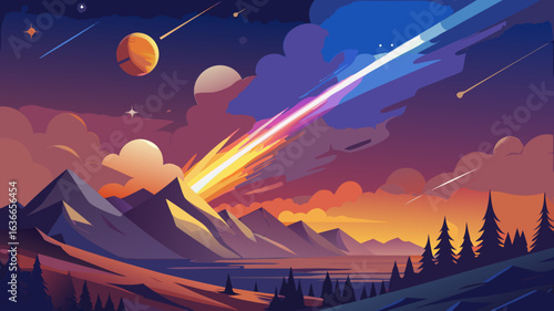 Dreamy starry winter landscape with crescent moon and glowing celestial hills, elegant abstract vector background for festive, seasonal, and Christmas design presentations.