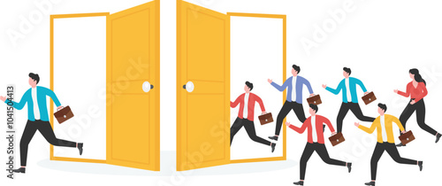 A group of businessmen ran into the open door together but only one businessman managed to get out