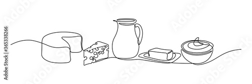 Milk and dairy products. Fresh farm milk, cheese, cottage cheese. Hand drawn illustration converted to vector. Isolated on white background