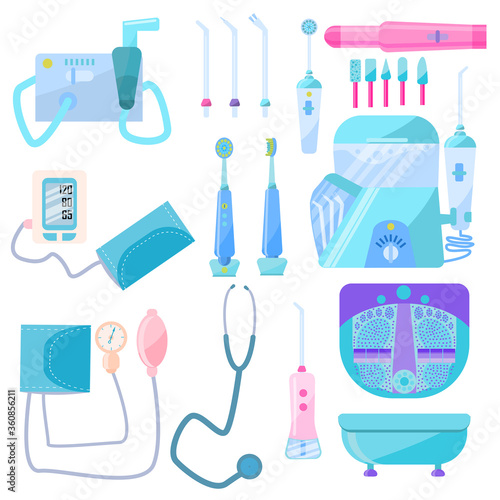 Home medical devices. Portable medical device machine, oxygen mask nebulizer blood pressure meter pulse monitor oximeter glucometer sugar test equipment neat vector illustration