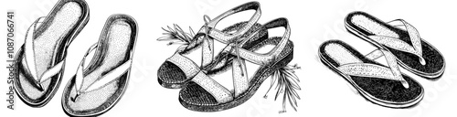 Set of black flip flop sandal icons with various decorative patterns on white background