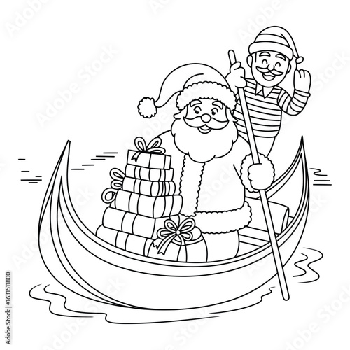 Santa and gondolier in a boat with gifts coloring page art colouring page