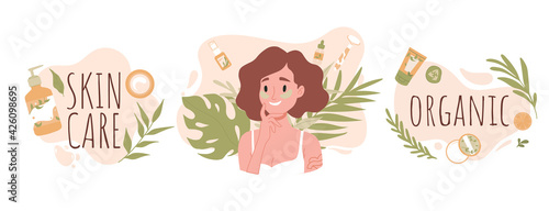 Skin care routine. Young girl face skin, organic natural cosmetic products. Korean cosmetics. Woman in towel portrait with eye patches, care supplies. Beauty procedures vector cartoon icon.