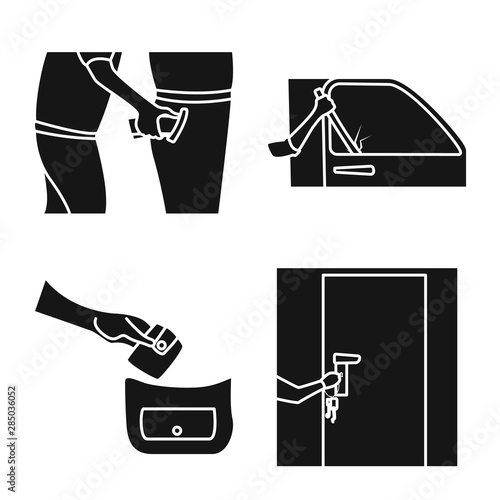 A thief sneaks into the house. The robber is trying to crack the door. Sign of robbery. Security concept. Vector illustration.