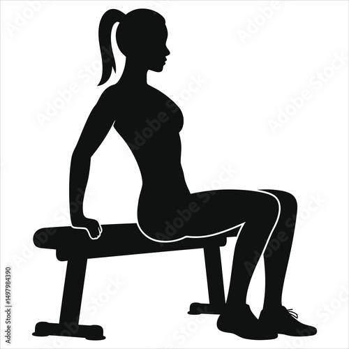 Woman performing incline bench press exercise vector silhouette./A simple, black silhouette of a woman performing an incline bench press exercise.