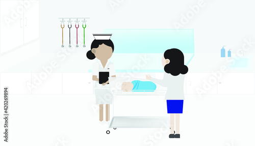 Illustration Neonatal ward  , Nursery ward. Neonatal intensive care and newborn babies lying on baby crib