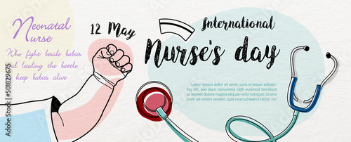 Closeup and crop hand of baby and stethoscope in outline drawing style with slogan and wording of nurse day, example texts on circle colors and white background.