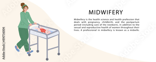 Female neonatologist is transporting a newborn baby at the maternity hospital. Cartoon banner with a midwife. Healthcare medical concept. Vector illustration with a place for the text.