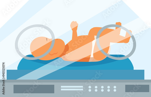 Newborn infant lies inside neonatal intensive care unit isolated on white background. Premature child sleeping in glass incubator box. Baby nursery. Colorful vector illustration in flat cartoon style