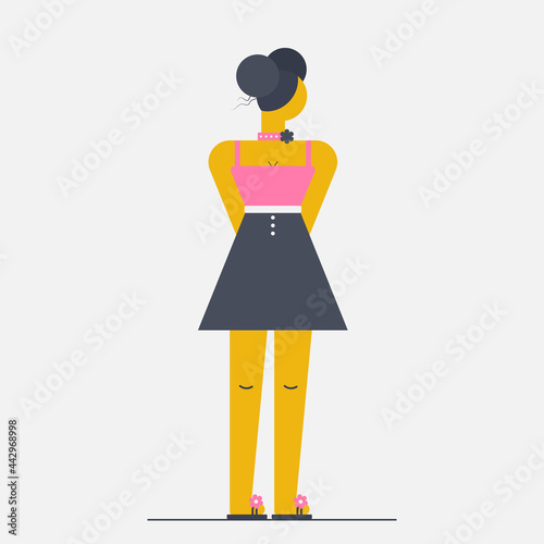 A standing woman in mixed style. Flat design with some details. Isolated personage on white background.