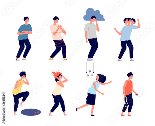 Mental disorders persons. Medical problems characters stress depressed people with anxiety various psychiatric problems vector flat characters. Illustration emotional problem and anxiety
