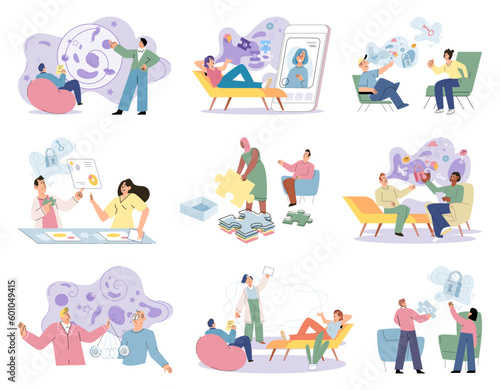 Psychotherapy, psychology concept set. Psychologist supports patients in therapy. Psychotherapist helps people with mental disorders, depression, anxiety. Flat isolated vector illustrations on white