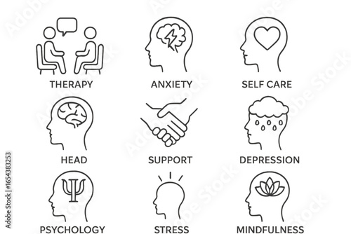 Mental health outline icons set – simple, wellness and therapy symbol collection