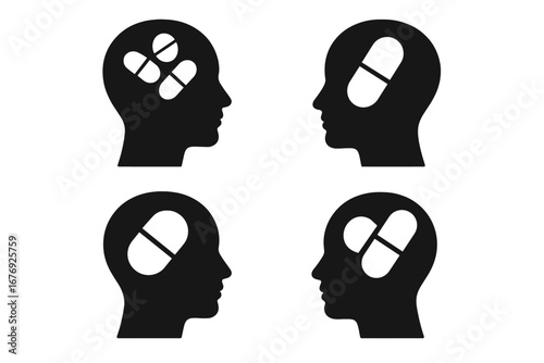 Set of psychological problems concept isolated on white background. Mental disorders, illnesses and psychiatry. Postnatal depression, autism and addictions flat icons. Psychology human head logo