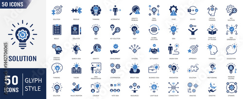 Solution icon set. Containing problem-solving, alternative, resolve, answer, maze, issue and success icons. Solid icon collection. Vector illustration.