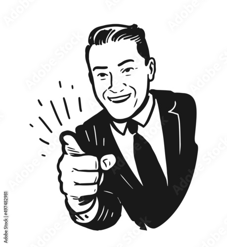 Cartoon retro salesman pays attention. Vector EPS8