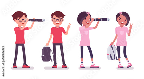 School boy, girl with a spyglass, v gesture. Cute small children with a rucksack, active young friend kids, smart elementary pupils aged between 7, 9 years old. Vector flat style cartoon illustration